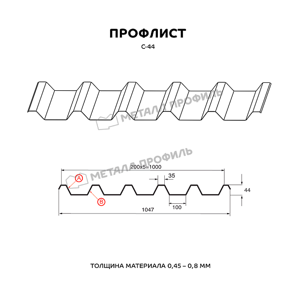 Профнастил С-44 может быть использован практически в любых сферах строительства. Этот профиль неизменно пользуется спросом как в частном секторе, так и на промышленных стройках. Профнастил с глубиной гофры 44 мм отличается очень высокими несущими способностями. Это самый высокий из профилей с наименованием С – «стеновой». С-44 пригодится, если вам необходимо: установить стены и переборки в щитовых постройках, сделать кровельное покрытие, оборудовать подсобные помещения, поставить забор. Помимо этого С-44 характеризуется повышенной прочностью для строительства каркасов различных сооружений и несъёмной опалубки для бетонирования. Профлист С-44 можно использовать в областях с высокими показателями годовых осадков и порывистыми ветрами. Профиль этого материала несимметричен. Верхняя сторона (А) представляет собой более динамичный рисунок из узких полочек и применяется для кровли. Сторона В смотрится более монолитно, подходит для всех остальных сфер применения.Покрытие ECOSTEEL®: